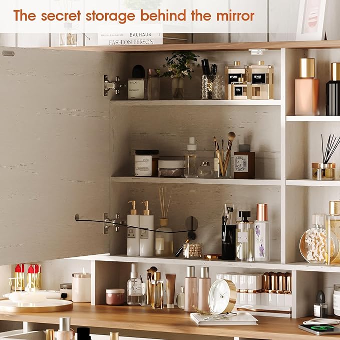 - Multi-functional Storage Space:This Vanity doesn't just have a lot of storage space,but it also has storage places for the different features of your makeup.Equipped with a spacious tabletop 5 drawers,2 side cabinets,open shelved cubbies,The special thing is that behind the mirror,there is a hidden storage space.