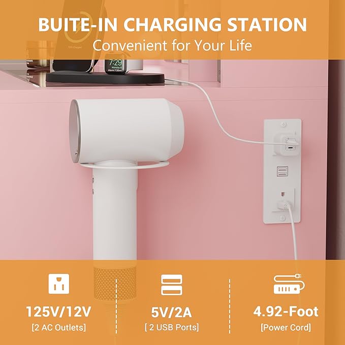 - 【BUILT-IN CHARGING STATION】Pink vanity with lights features the built-in power strip with 2 outlets and 2 USB ports, you can use eazily of curling irons, hair dryers, and phone charging. With a hair dryer rack on the right, so you don't worry again about turning off the lights and not being able to find hair tools.