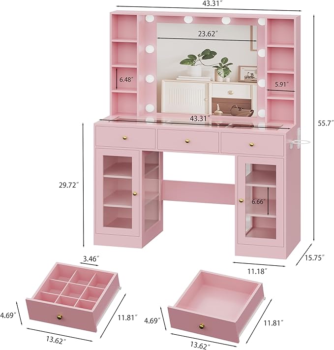 - 【GLASS TOP VANITY DESK】Overall size is 43.3"(L)x15.7"(W)x55.7"(H), Pink vanity desk with mirror and lights offers ample storage with 2 glass cabinet, 3 spacious drawers and 6 storage shelves, perfect for keeping yours neatly organized. Makeup vanity features the HD glass vanity tabletop, which give you a clear view to keep neatly organized drawers. Perfectly meets your needs of aesthetics and practicality,