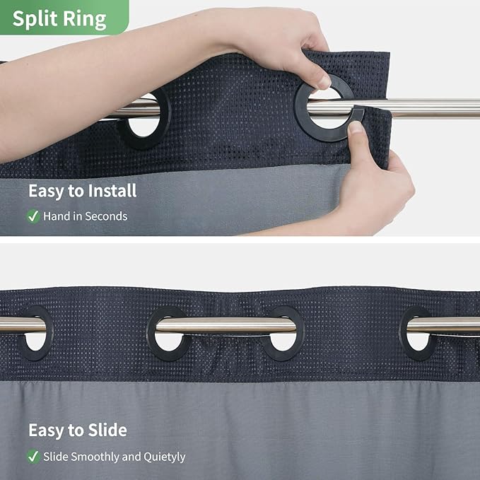 - 【Ringless Shower Curtain】:This shower curtain with no hooks features an innovative "open ring" that allows for easy hanging and hassle-free installation.No need to remove the shower rod or purchase additional hooks
