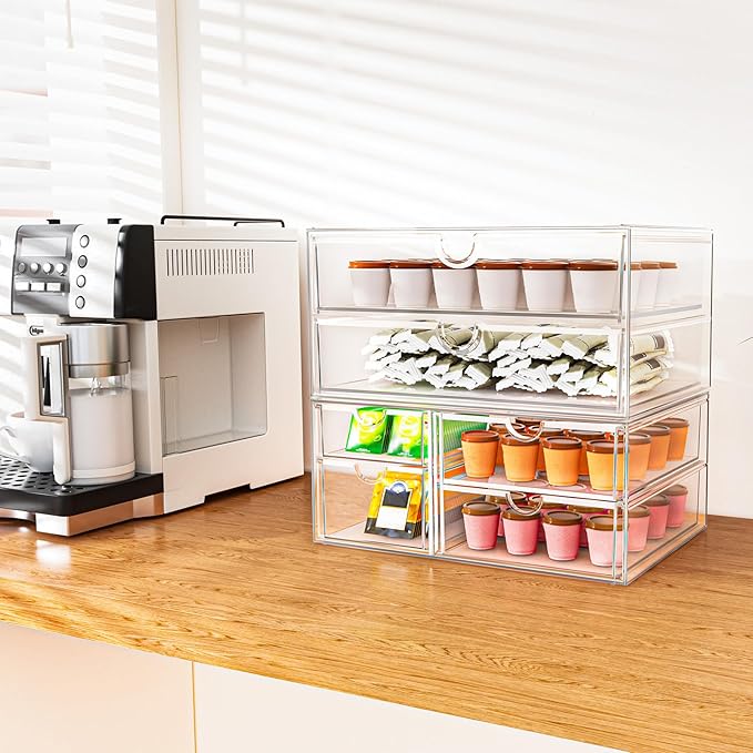 - Flexible Combination: Total 2 sets storage organizers with 6 drawers,You can flexibly use our storage organizer for house organization and storage according to your needs , The storage containers are stackable, with silicone mat, vertical storage will save a lot of space. You can also use them side by side. Put your small objects on top of acrylic bins to make your countertop space more tidy.