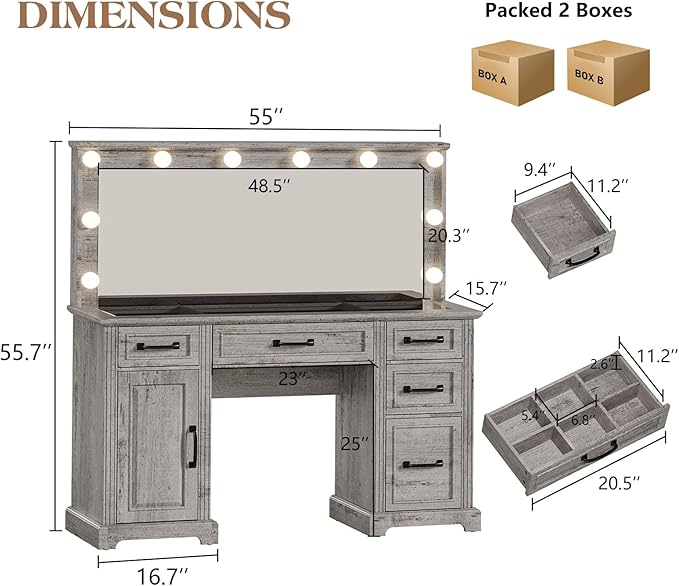 55'' Farmhouse Vanity Desk with Mirror and Lights, Large Makeup Table with Charging Station, Glass Tabletop & 5 Drawers, Rustic Dressing Table for Bedroom, Light Grey
