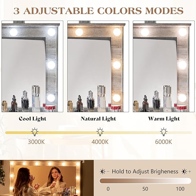 - 【Hollywood Makeup Lighting】Equipped with 10 bright Hollywood bulbs and a large mirror, you can freely switch 3 different light colors Cool, Natural and Warm and brightness to achieve a flawless makeup look