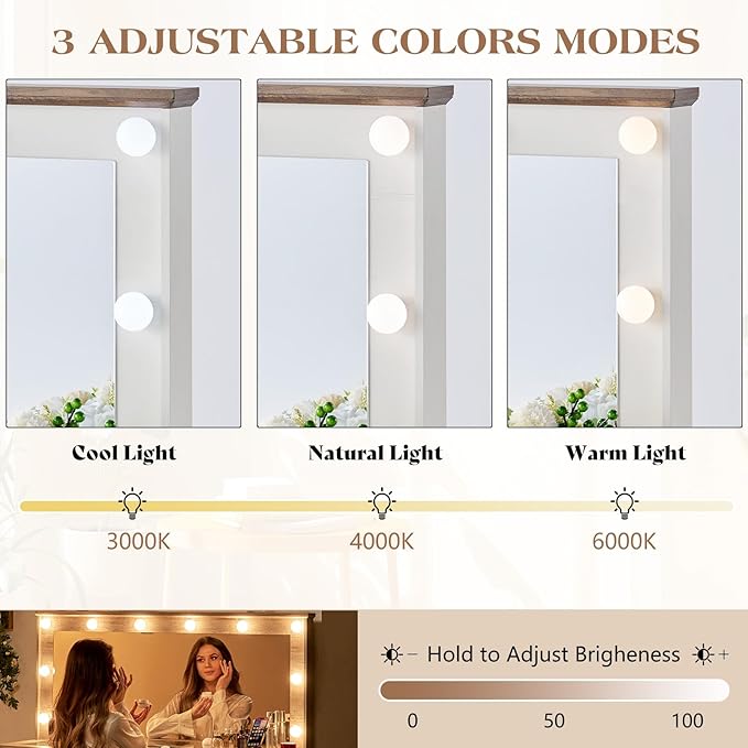 - 【Hollywood Makeup Lighting】Equipped with 10 bright Hollywood bulbs and a large mirror, you can freely switch 3 different light colors Cool, Natural and Warm and brightness to achieve a flawless makeup look