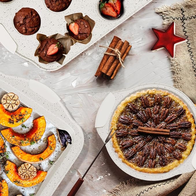 - Versatile 11 Piece Baking Set: The baking pan set includes 2 cookie sheets, 1 roasting pan, 2 muffin pans, 2 pie pans, 1 square pan, 1 pizza pan and 2 loaf pans, covering all the essential baking needs for your home