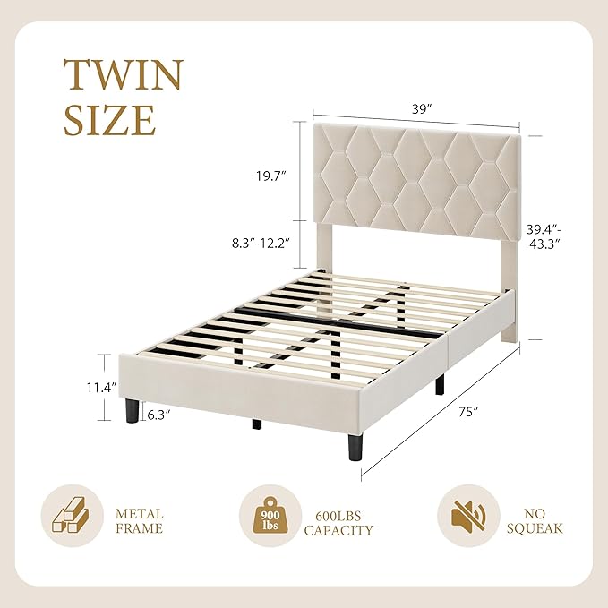 - 【Sturdy & Durable Construction】: This beige twin size bed is expertly crafted from high-quality metal and wood, featuring 12 durable wooden slats and a tightly padded foam frame. It supports up to 600 pounds, providing excellent stability. Additionally, the heavy-duty legs are equipped with round plastic caps to protect your floors from scratches