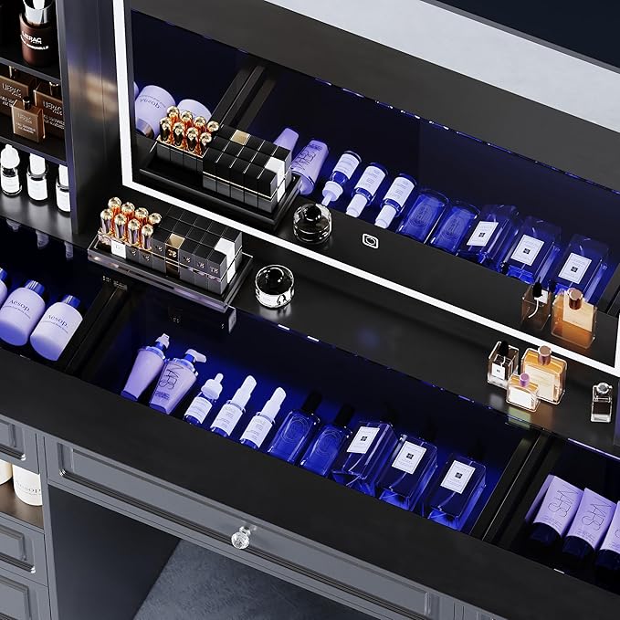 - ✅【Glass desktop design】 Our vanity glass tabletop is a true gem for your dressing space! With its crystal-clear surface, it showcases your cosmetics and jewelry like precious works of art, making every item stand out. Made of top-notch toughened glass, it's not only elegant but also highly durable, easily handling the daily wear and tear. Cleaning is a piece of cake – just a gentle wipe with a soft cloth, and it's as good as new.