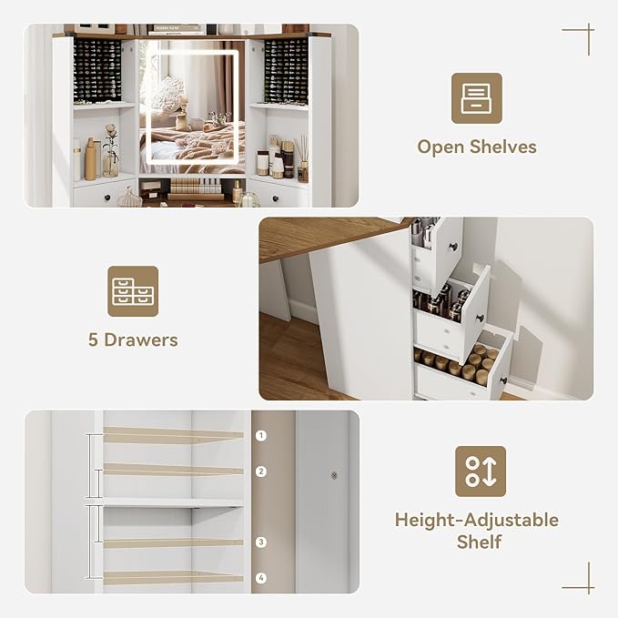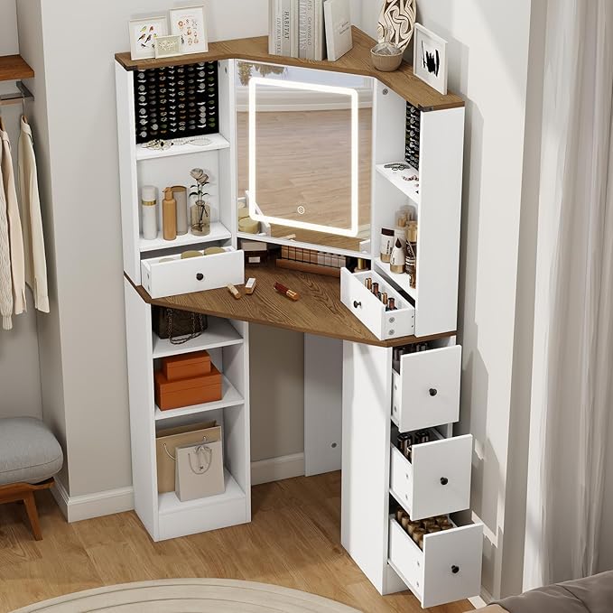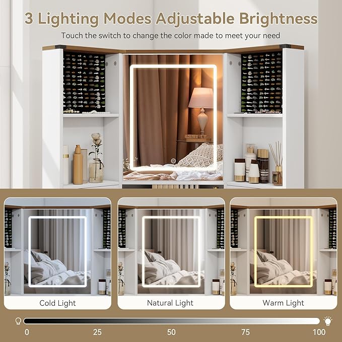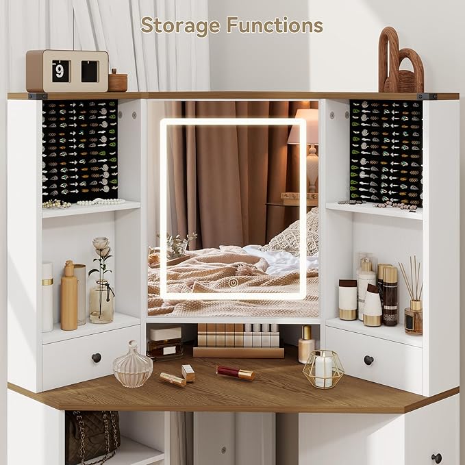- Perfect Corner Design: The design of our vanity with LED lights closely fit with the corner of the bedroom or bathroom, saves space, and creates a corner suitable for storing and applying cosmetics