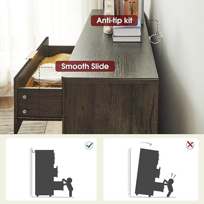 - 【Built to Last, Crafted for Safety】 Constructed with thick engineered wood panels and supported by a sturdy base, this dresser offers long-lasting stability; Rounded corners and included anti-tip hardware provide added safety for households with children or pets