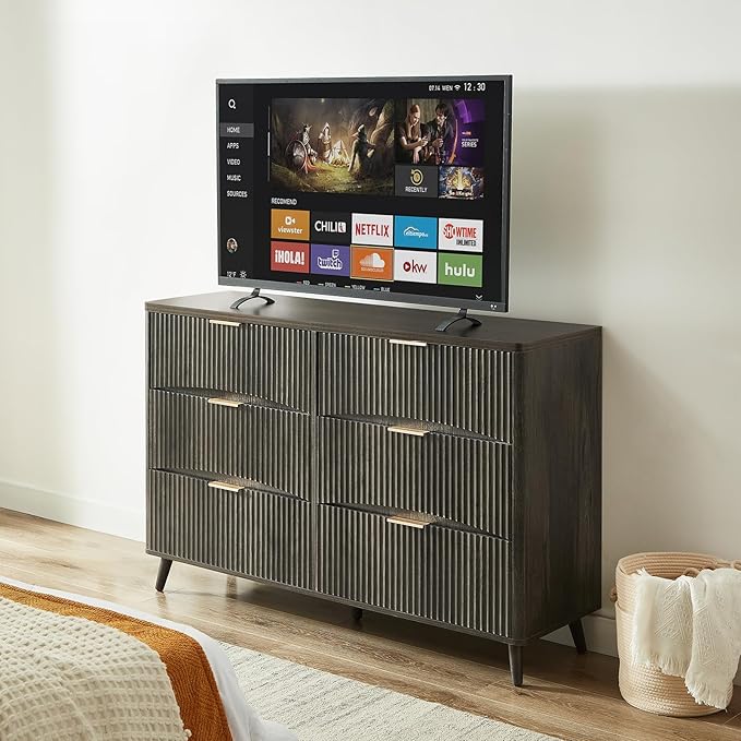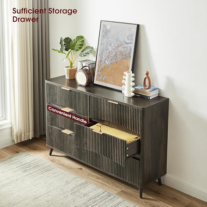 - 【Timeless Mid-Century Aesthetic】 Showcasing a sculpted fluted front and matte gold handles, this 6-drawer dresser blends retro flair with modern elegance; Clean lines and a warm walnut finish create a look that’s refined yet inviting—perfect for enhancing bedrooms, entryways, or living rooms