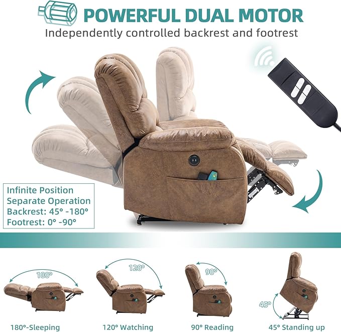 - 【Dual Motor Design & Infinite Position】What’s the difference between the dual motors and the single motor for the lift chair? The dual motor recliner chair’s backrest and footrest can work independently, lifting and reclining more steadily, allowing you to adjust the recline angle up to 180° for personalized relaxation and optimal comfort, and can be used as a bed for lounging completely flat. You can sit with your legs fully extended without the backrest reclining when you watch TV or reading.