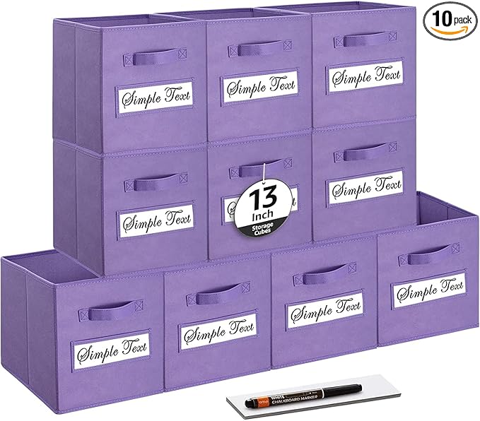 artsdi 13x13x13 storage cube bins (Set of 10) Fabric storage cubes with 10 Labels Window Cards & a Pen, storage cubes 13x13, Collapsible 13 inch cube storage bins, Cubby Organizer Boxes, Purple