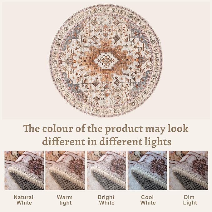 Tangsoo Vintage Round Rug 4ft, Washable Circle Rug, Non Slip Small Boho Round Rug, Low Pile Circular Rugs, Round Carpet for Bedroom,Entryway,Nursery,Dorm,Kitchen,Turmeric