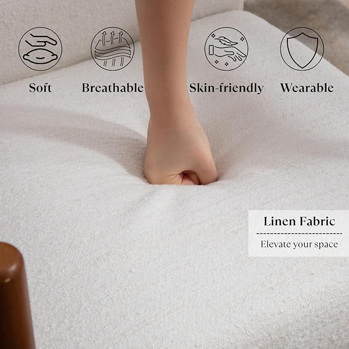 Mid-Century Accent Chairs Set of 2, Modern Linen Fabric Lounger Chairs Upholstered Armchairs with Walnut Wood Frame, Upholstery Back Leisure Chairs for Living Room, Balcony, White