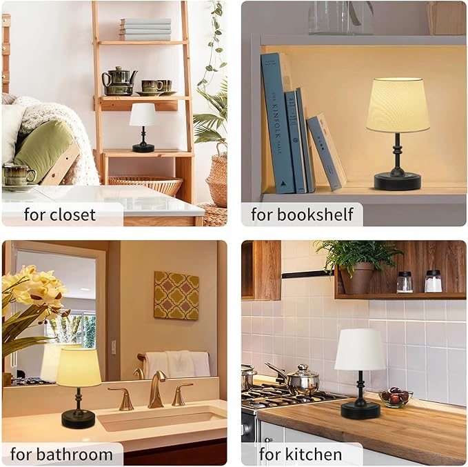 ONEWISH 2 Pack Small Cordless Lamp, Battery Operated Table lamp Dimmable, 4000mAh Rechargeable, Touch Bedside Lamp with White Fabric Shade, 2700K Bulb Included, for Dining, Patio, Bathroom(Black)
