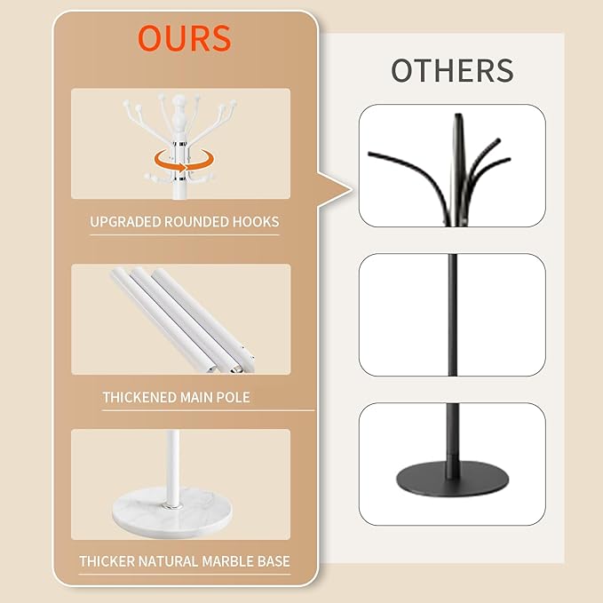 - 100% 15 INCH NATURAL MARBLE BASE:This coat rack freestanding is made of 100% natural marble,which diameter is 15 inch. Carefully selected natural marble, each piece has a unique vein carved by nature (not a quality issue). This base is capable of supporting 300 LBS, hanging heavy winter coats and briefcases very firmly without wobbling