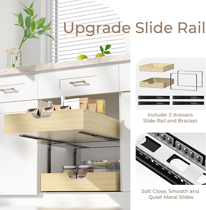 - Soft Close Slides: Pull out cabinet organizer with soft-close heavy-duty metal slides for smooth, noiseless operation and durable, high-quality materials. Full-extension slides of slide out drawers can hold up to 60 lbs. Double Tier Pull Out Drawer Organizer available in three mounting heights
