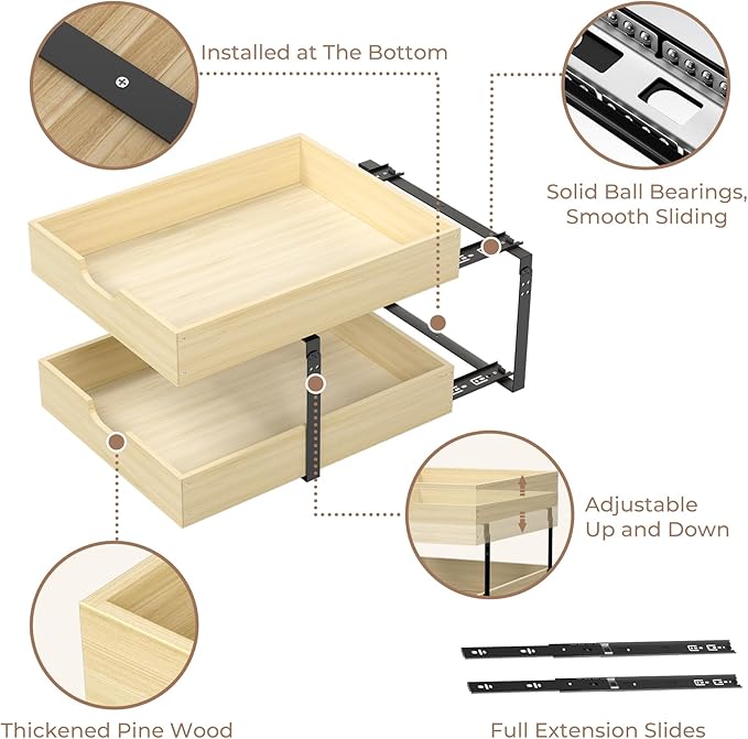 - High Quality Material: The slide out wood drawer organizer is made of solid wood, which is sturdy, durable and high grade. The pull out shelves feature natural wood texture for more elegance. Slide out cabinet organizer is well-designed to optimize cabinet storage space and improve ease of use.