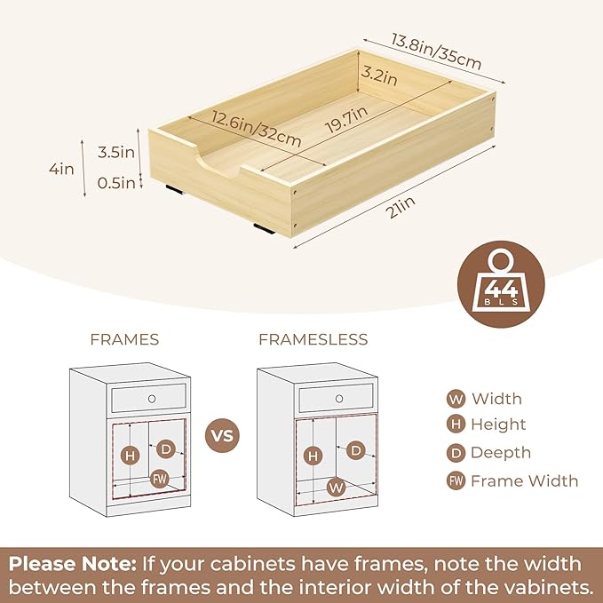 - Proper Size Selection: The pull out cabinet drawer size is: 14”W X 21”D X 3.5"H, requiring a cabinet opening net width of more than 15.5” wide (measure net width from hinges) and a min cabinet depth at least 22 inches. Please measure your cabinets to select the right size pull out drawers.