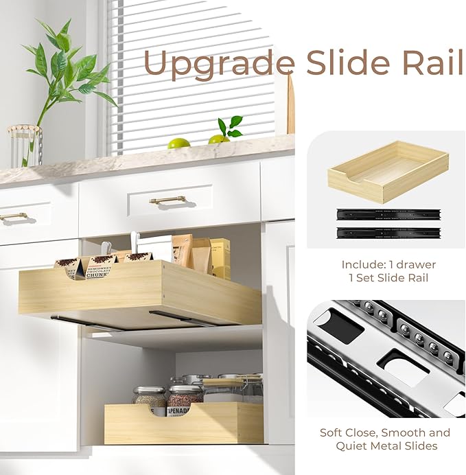- Soft Close Slides: Pull out cabinet organizer with soft-close heavy-duty metal slides for smooth, noiseless operation and durable, high-quality materials. Full-extension slides of slide out drawers can hold up to 60 lbs.