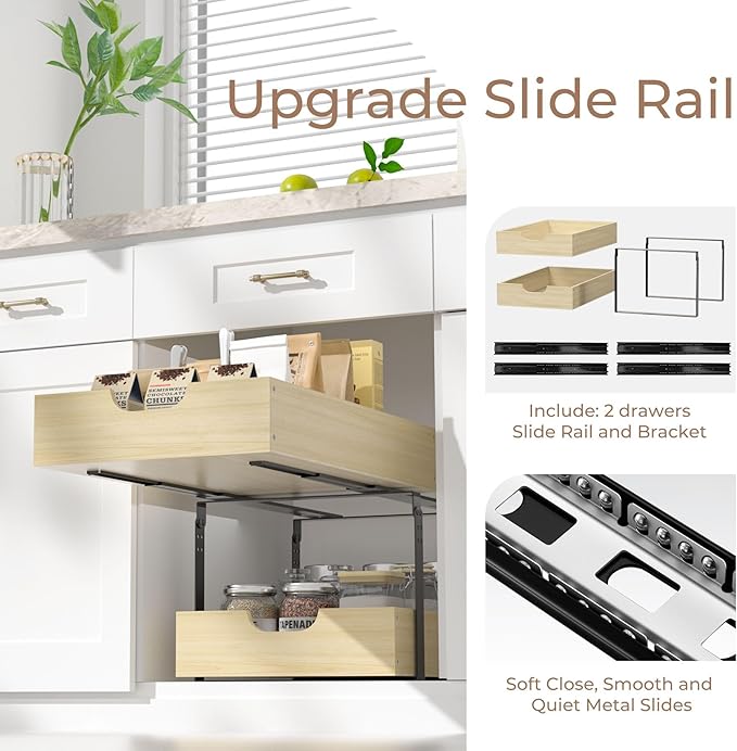 - Soft Close Slides: Pull out cabinet organizer with soft-close heavy-duty metal slides for smooth, noiseless operation and durable, high-quality materials. Full-extension slides of slide out drawers can hold up to 60 lbs. Double Tier Pull Out Drawer Organizer available in three mounting heights