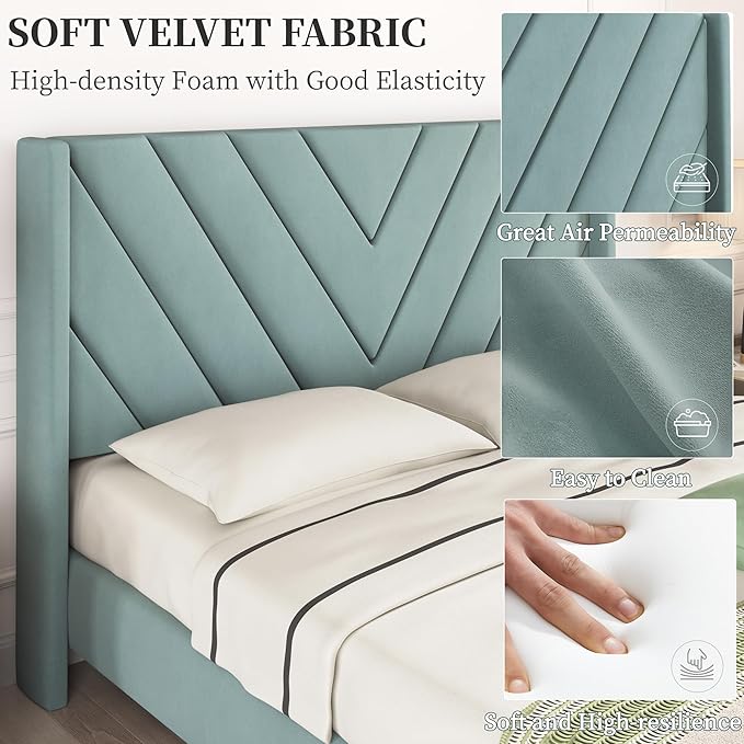 - Wing Side Design: Designed with a wing side on the wide upholstered headboard and skin-friendly velvet fabric, the queen bed frame can be a must-have in any restful retreat. (No Box Spring Needed)
