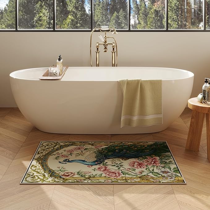 Door Mat Indoor Entrance 2x3 Rug Machine Washable Floral Peacock Animal Small Area Rug Non-Slip Low Pile Throw Rugs for Entryway, Kitchen, Front Door, Entry, Kids Room (Beige)