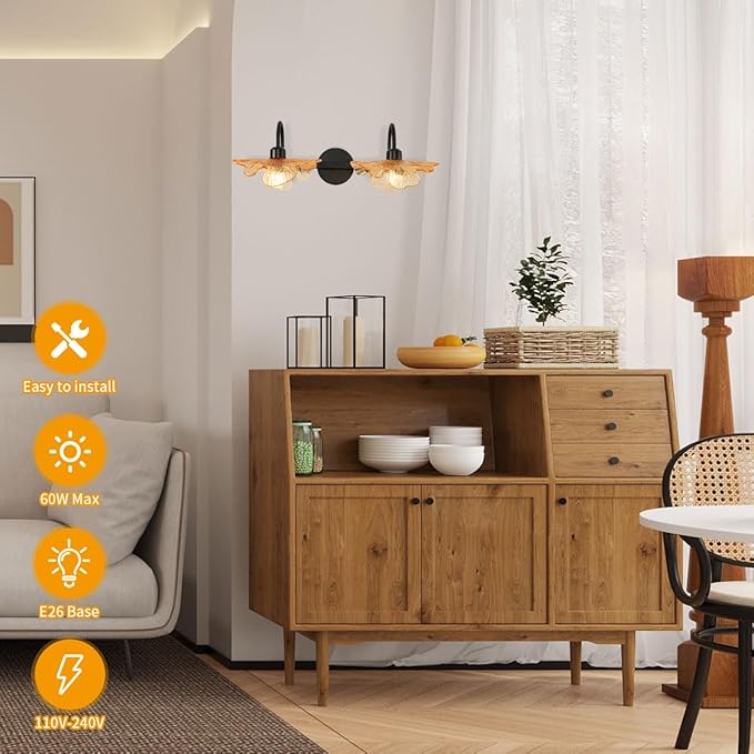 2 Light Bathroom Vanity Light Black Wall Sconce with Amber Flower Glass Shade mid Century Wall Light Vintage Wall Sconce Matte Black Vanity Light Over Mirror for Bedroom Hallway Living Room