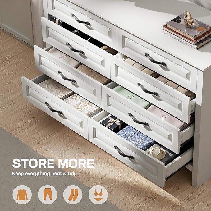 - SPACIOUS 8-DRAWER STORAGE: Measuring 15.7" D x 47.2" W x 31.6" H, this dresser offers eight deep drawers to help you keep folded clothes, accessories, and daily essentials neatly organized. The wide tabletop provides extra space for décor, mirrors, or lamps. All drawers come with pre-installed metal glides, ensuring smooth and reliable performance from day one—no fiddly drawer rails to assemble.