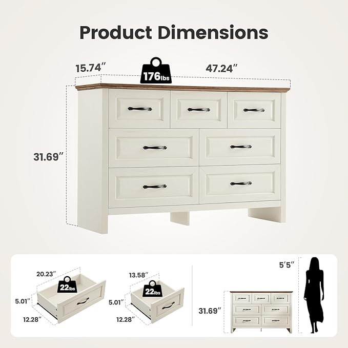 - FARMHOUSE 7 DRAWERS DRESSER: With a width of 47.2", this farmhouse-style dresser easily fits into bedrooms, living rooms, or entryways—adding not only storage but a warm, rustic charm to your home. The natural wood texture and clean farmhouse lines create a cozy, welcoming atmosphere that blends beautifully with modern or traditional décor.