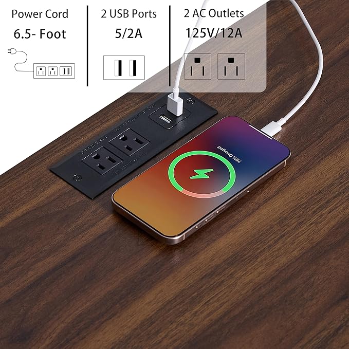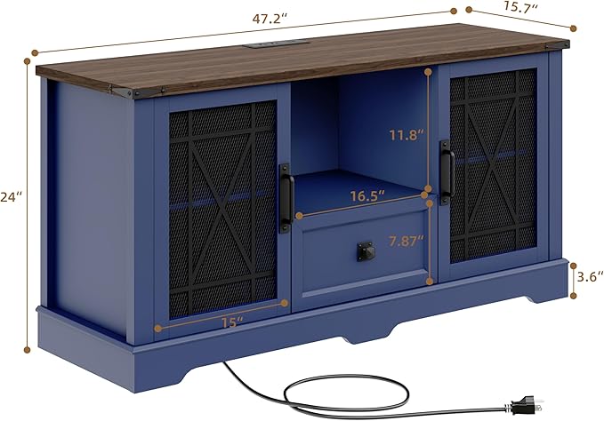 - Farmhouse TV Stand with Charging Station: This Blue farmhouse TV stand features 2 power outlets, 2 USB ports, and a 6.5 ft power cord for convenient device charging. A socket in the top shelf allows easy access to charge phones and other gadgets. The 2.3-inch round hole on the back organizes cords and cables, keeping your desktop spacious and tidy while keeping devices within reach