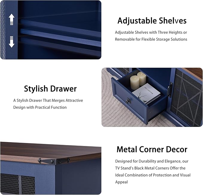 - Functional Design: This TV stand offers 3 adjustable shelves in each iron mesh cabinet with 3 height settings, ideal for storing items of varying sizes. The semi-open highboy cubby is perfect for media equipment and art display, while a large drawer provides personalized storage solutions