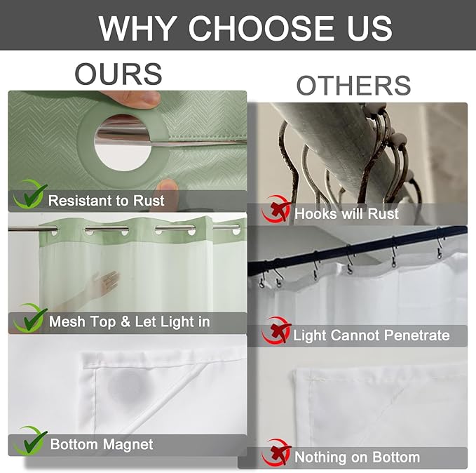 - NO HOOK SHOWER CURTAIN SET: Install in 25 seconds without the hassle of annoying and messy hooks, and no need to remove the rod!