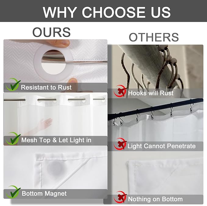 - NO HOOK SHOWER CURTAIN SET: Install in 25 seconds without the hassle of annoying and messy hooks, and no need to remove the rod!