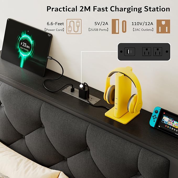 - Charging Storage Headboard: The integrated charging station includes 2 outlets, 1USB port, and 1 Type-C port for all your device-charging needs. Equipped with sturdy, waterproof wooden platform fits snugly against the wall