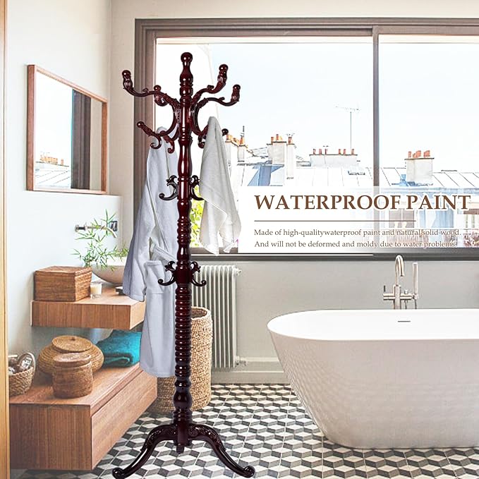 Wood Coat Rack Freestanding, Natural Coats Tree Stand with 14 Hooks, 73" Sturdy and Easy Assembly Coat Rack Stand for Entryway, Hallway, Bedroom, Bags, Hats (Tri-legged Base, Rosewood)