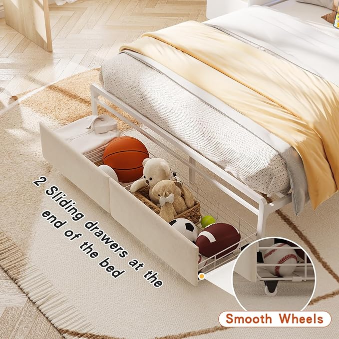 - Under-bed Storage Drawers with Pulleys:This bed comes with storage drawers with pulleys to efficiently organize your belongings. You can store extra bedding,clothing or seasonal items out of sight, yet have them readily available when you need them. The pulleys on the drawers allow you to pull them out effortlessly and also protect the floor from scratches.