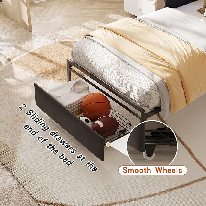 - Under-bed Storage Drawers with Pulleys:This bed comes with storage drawers with pulleys to efficiently organize your belongings. You can store extra bedding,clothing or seasonal items out of sight, yet have them readily available when you need them. The pulleys on the drawers allow you to pull them out effortlessly and also protect the floor from scratches.