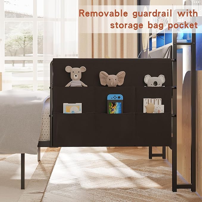 - Removable Bedside Guardrail:This twin bed frame has two bedside guard rails with storage pockets. The guard rails provide added protection,especially for boy/girl. The two bedside storage boxes can store glasses,books,cushions, stuffed animals,dolls and more. Keep everything organized and within reach.The guardrails are removable, giving you the flexibility to customize the bed setup to your needs.