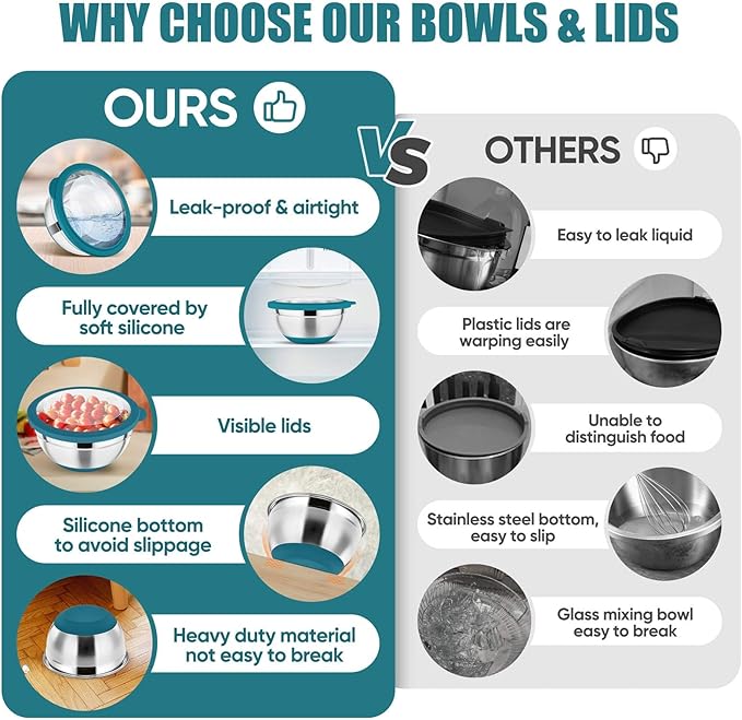 - 【Upgraded Transparent Blue Lids】-- Each mixing bowl matched with fitting visible lid, See-through plastic lids could keep food fresh and letting you see what’s inside without opening, Avoid the hassle of rummage, Silicone seal all-around wrapped plastic cover, Offer a snug air-tight fit to the bowl to create an airtight storage container, Dust proof and avoid food spilling and leaking, Convenient to transport food for camping, The protruding lid handle design make lid easier to open