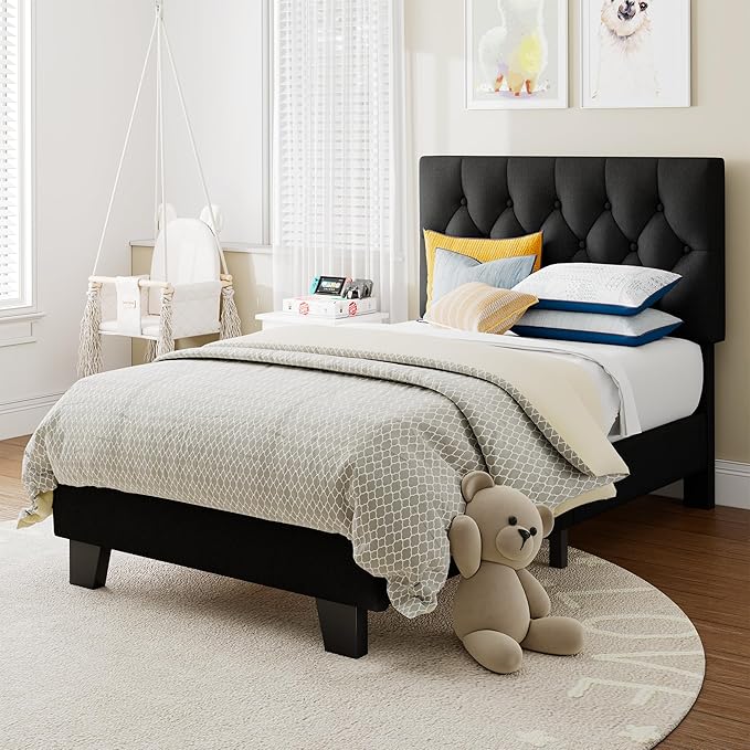 Twin Upholstered Bed Frame with Headboard, Button Tufted Linen Bed Base, Platform Bed with Wood Slat, Heavy Duty, Easy Assembly, No Box Spring Needed, Black