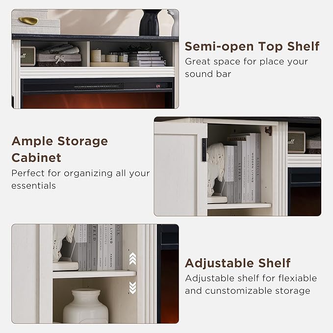 - Durability You Can Trust: Built with high-quality MDF and reinforced particleboard, this farmhouse tv stand with fireplace is made to last for years. The solid 1-inch thick tabletop, which supports up to 150 lbs, and the 3-inch high wooden support base ensure unmatched stability. The well-structural design, combined with reinforced panels, guarantees superior strength and durability, making this media console a long-lasting addition to your home