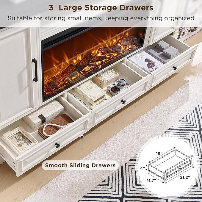 - Ample Storage for Every Need: At 70"W x 15.5"D x 35.7"H, this tall fireplace tv stand offers exceptional storage to keep your space organized and clutter-free. The open soundbar shelf provides easy access to media devices or décor, while 3 spacious drawers offer generous room for essentials. Plus, 2 large adjustable-shelf cabinets are ideal for game consoles, DVDs, and books, allowing you to customize storage for items of all sizes. The wide 70" tabletop fits TVs up to 80"