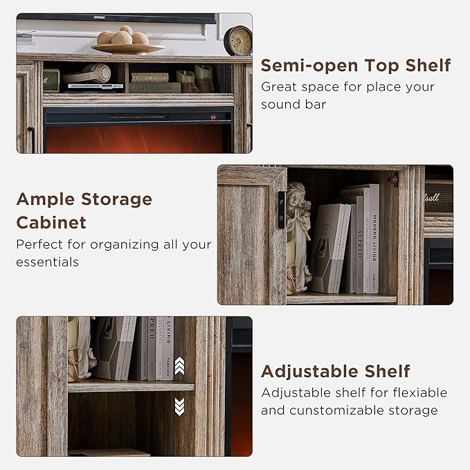 - Durability You Can Trust: Built with high-quality MDF and reinforced particleboard, this farmhouse tv stand with fireplace is made to last for years. The solid 1-inch thick tabletop, which supports up to 150 lbs, and the 3-inch high wooden support base ensure unmatched stability. The well-structural design, combined with reinforced panels, guarantees superior strength and durability, making this media console a long-lasting addition to your home