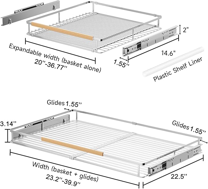 - Upgraded Expandable Design: This pull out cabinet shelf is designed to fit in most cabinets. The width of the wire basket can be adjusted from 23.2'' to 39.9''. Unlike the traditional bottom-mounted pull out cabinet organizer, our pull out cabinet organizer can not only expandable but also adjust the height to be installed on the side, not only at the bottom. The new expandable design gives you a better experience and saves your space.