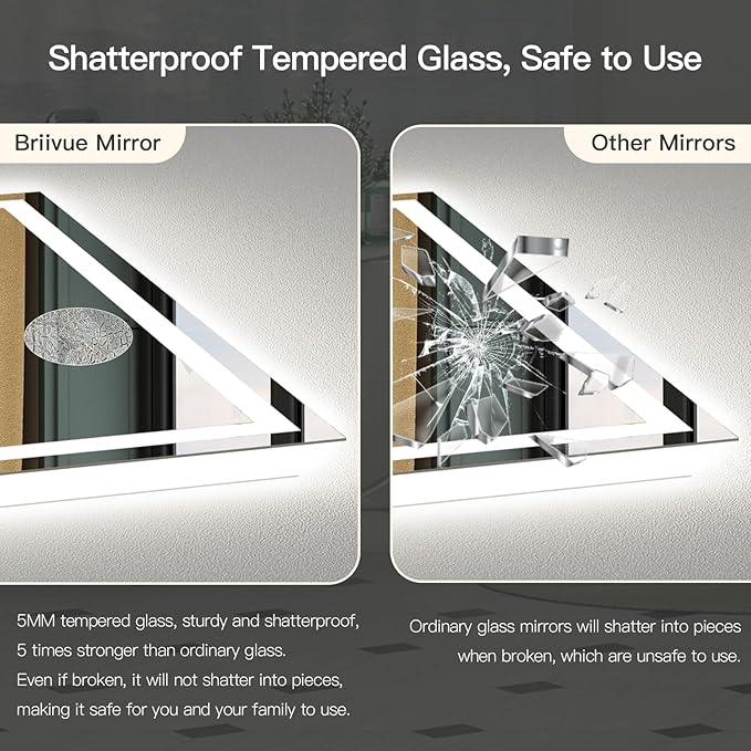 - [Shatterproof & Durable]: Made with tempered glass, this led mirror for bathroom is shatter-resistant and safe. Even if broken, it won’t create sharp pieces. The corrosion-resistant epoxy coating ensures long-lasting use.