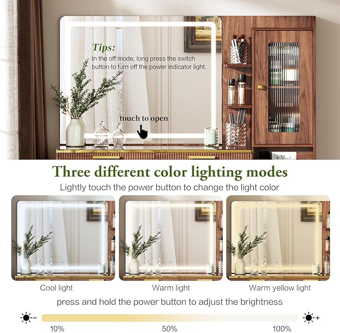 - 【3-Color LED Light】The vanity desk features a specially shaped dimmable lighting mirror with 3 different LED lighting colors, including natural, warm and cool light, for a variety of indoor lighting and environments to optimize your makeup