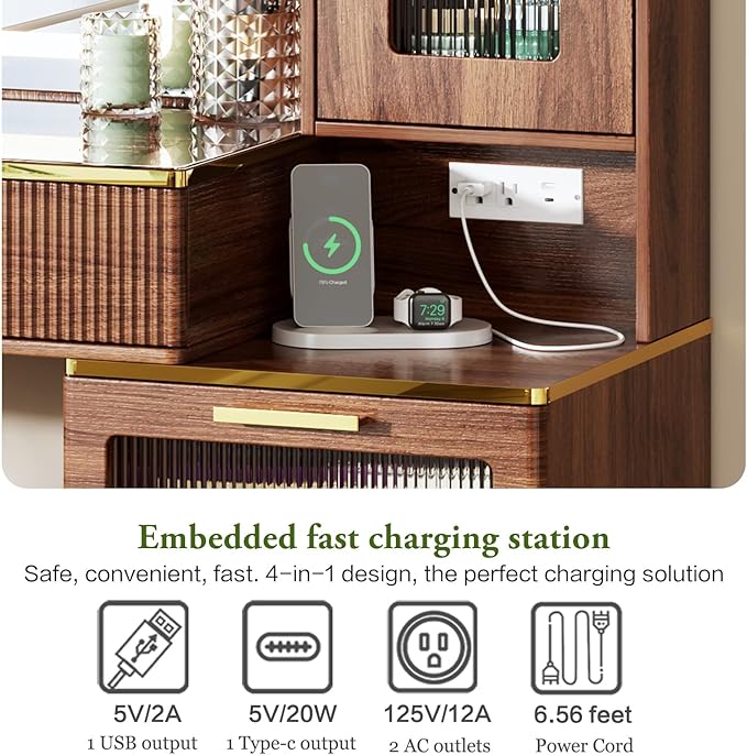 - 【Vanity Table with Charging Station】-This makeup vanity features a charging station, includes 2 standard plug sockets and 2 USB ports, which can be more convenient to connect your hair dryer, curling iron, and it can also charge your phone, tablet or other mobile devices, The unique design is more convenient for you to use.