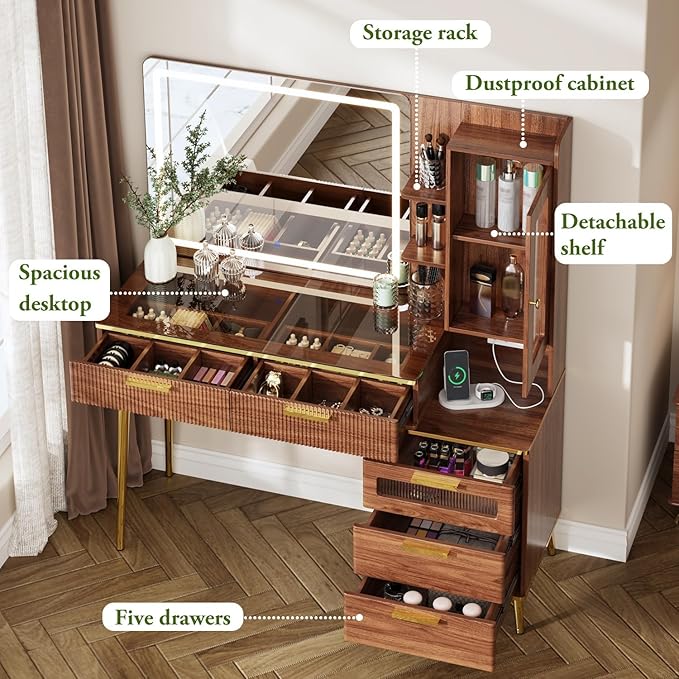 - 【Powerful Vanity Storage Space】-Are you still bothered by the fact that you have too many cosmetics and nowhere to put them? Try this makeup table with great storage function, containing 5 drawers, 3 open shelves, 2-layer hidden storage shelves with glass door, all your cosmetics and makeup tools can be sorted and stored neatly to the vanity table. Let you say goodbye to messy storage. It will be a great choice for you.