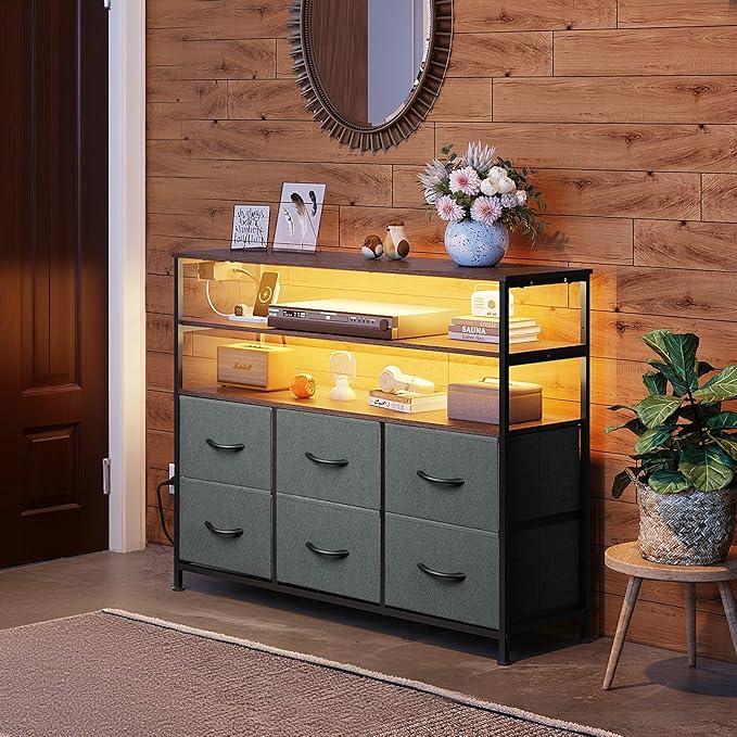 WLIVE Grey TV Stand for 40, 45 inch TV, Entertainment Center with LED Lights & Charging Station, TV Media Console Table with 6 Fabric Drawers and Open Shelves for Living Room, Hallway, Dark Grey